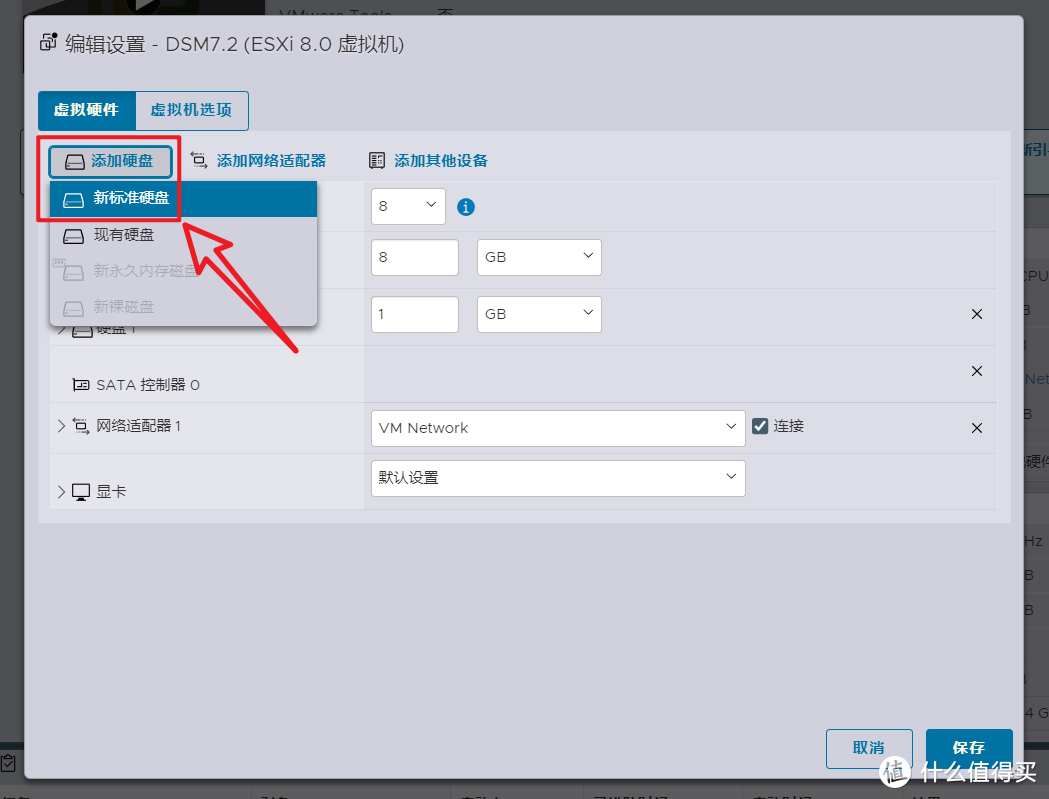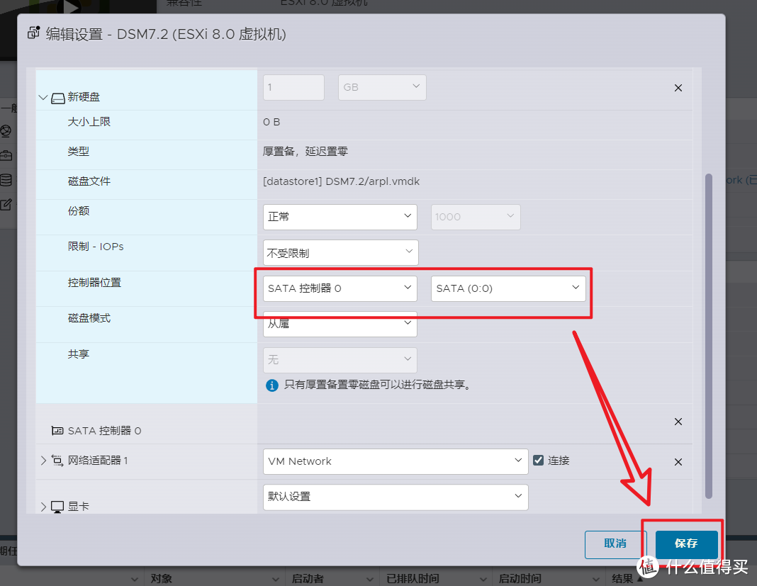 🔺这块硬是当做群晖的存储盘使用的,所以容量根据自己的实际情况选择,只要不低于20GB,不超过大小上限即可。控制器位置还是选择“SATA控制器”,标识看看是不是“SATA(0:1)”,完成之后“保存”。