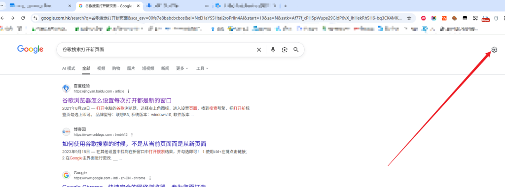 随便搜索个东西,在搜索页面的右上角有个扳手,点击一下,弹出窗口选择更多设置,然后其他设置,然后勾选“在新的浏览器窗口中打开所选的每条搜索结果”,然后保存即可。